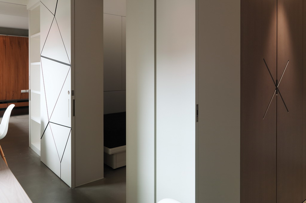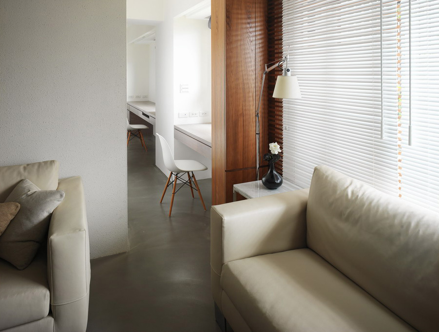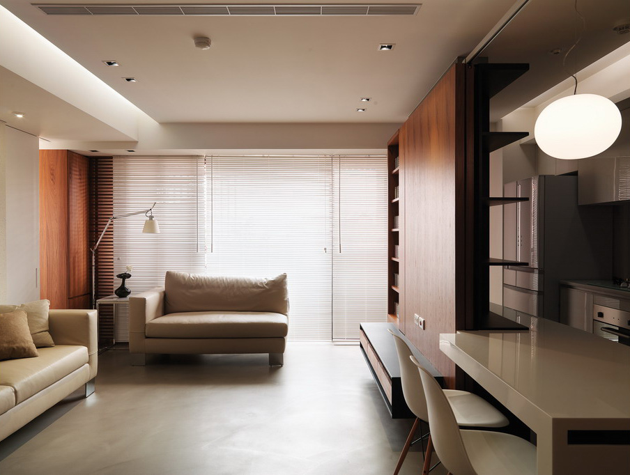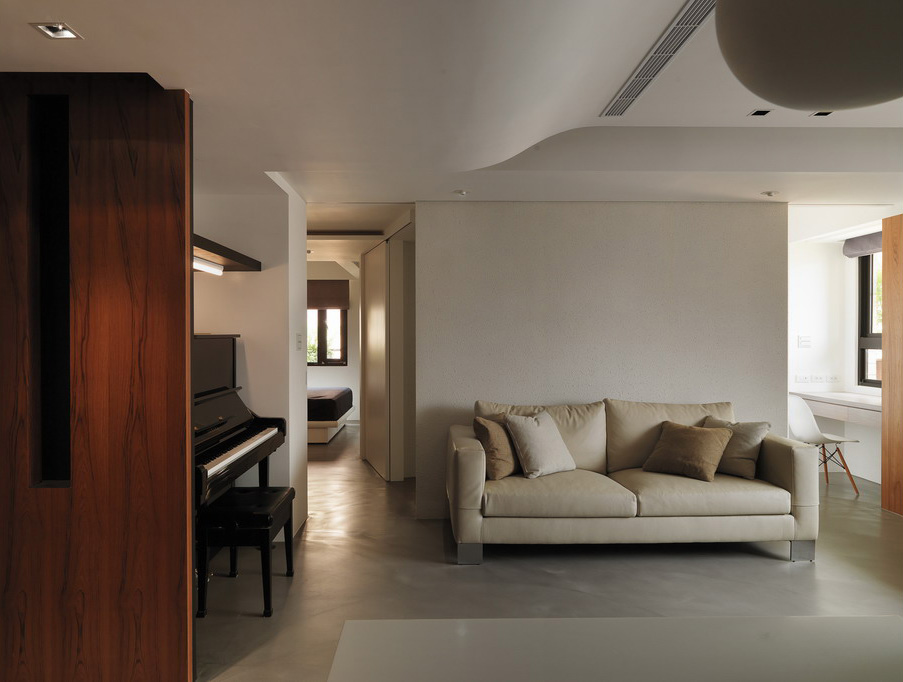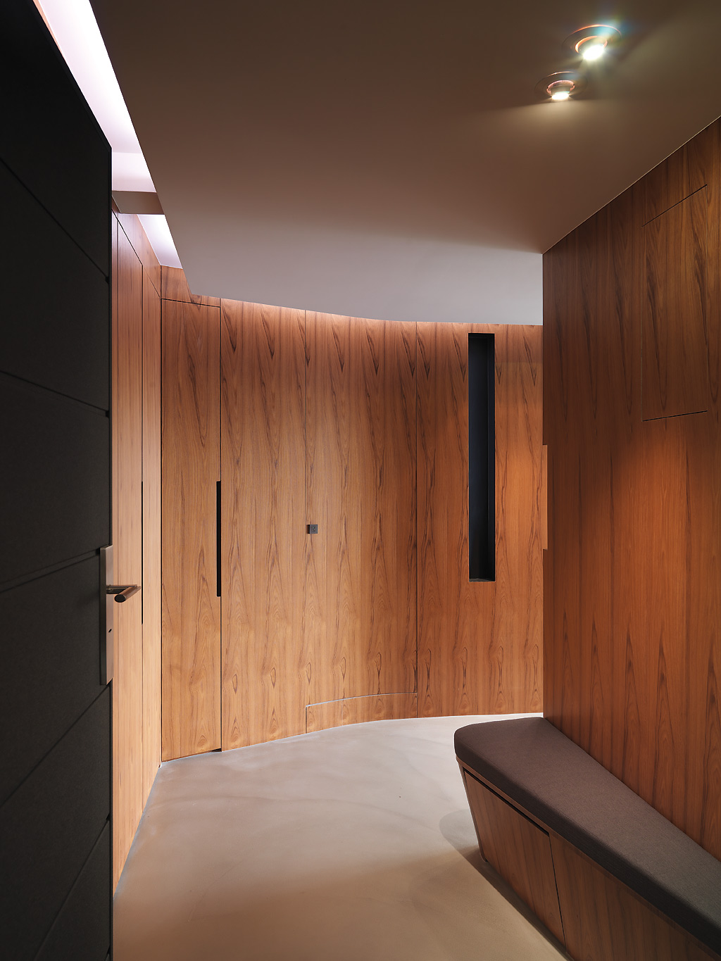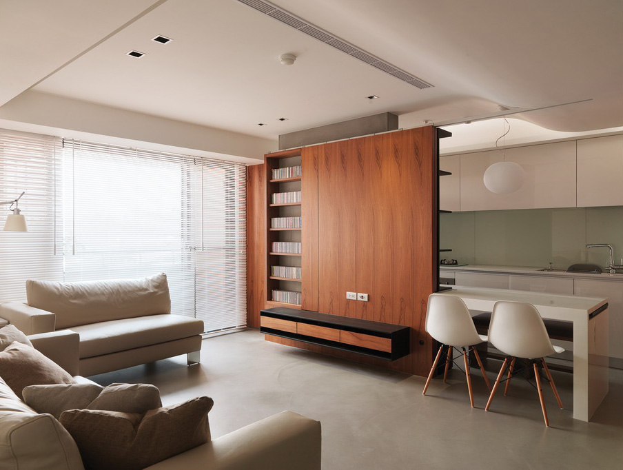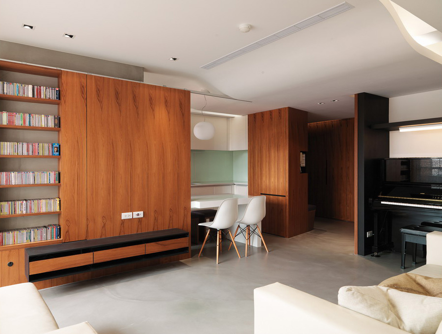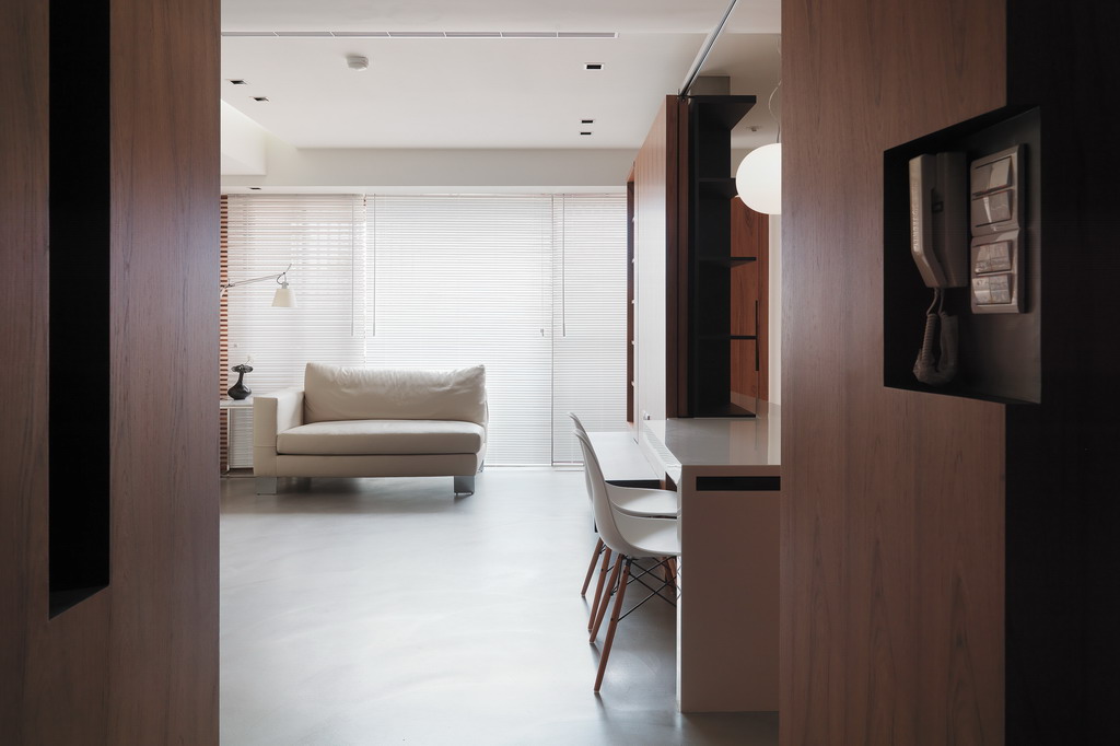 運用線條雕塑空間 利用優美弧線引導行進動向 自入口玄關處伸展的弧牆 轉折出隧道般的神秘感 一致性的木質天然紋路 模糊了廁所、廚區門片的開口線條 完整空間整體氛圍
